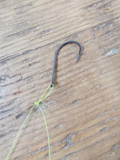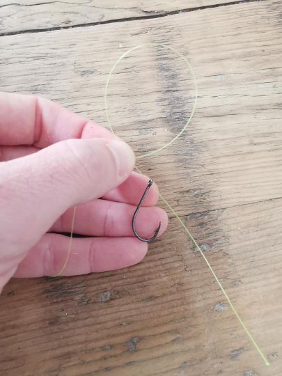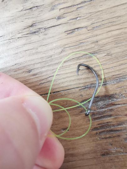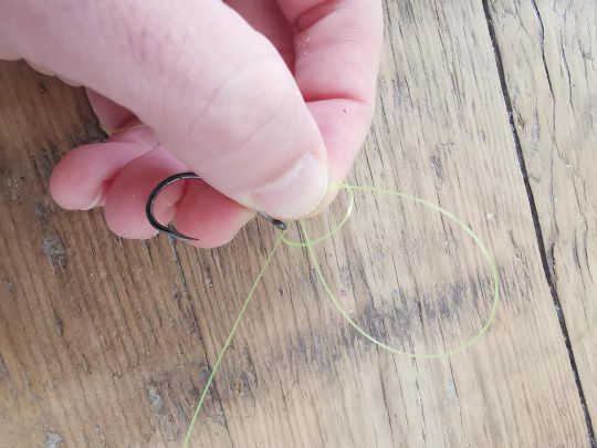 Passare l'estremità libera dietro l'occhiello per creare un secondo occhiello. In questo modo si intrappola l'amo.