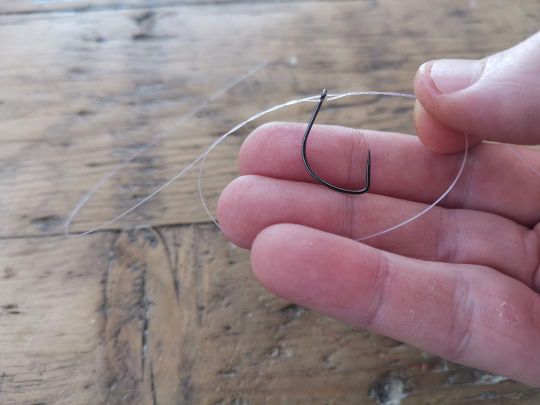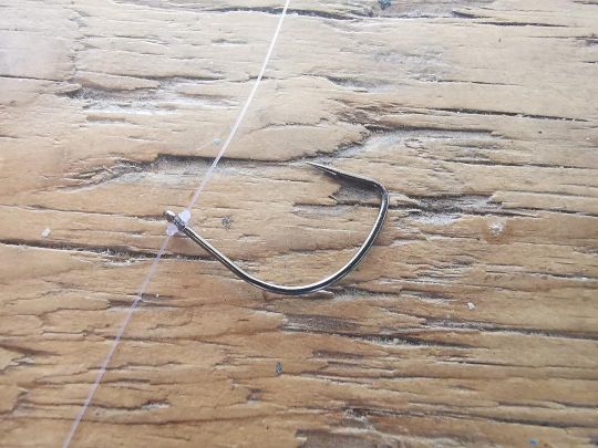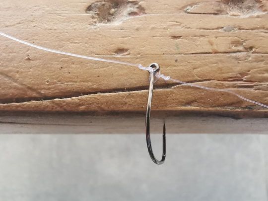 Una volta che il nodo è perfettamente stretto, l'amo è intrappolato tra due fili e si presenta perfettamente, con il gambo orizzontale e la punta verso l'alto.