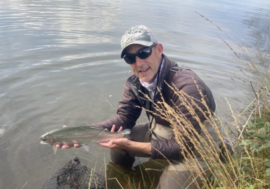 Poi ho voluto girovagare e cercare di trovare qualche trota sulle sponde. Ne ho viste poche, ma ho trovato una zona nel tratto a monte dove si erano rifugiati alcuni pesci. Sono in pochissima acqua, poiché il lago è basso a causa della mancanza di precipitazioni, e riesco ad attaccarli a secco. Metto in bobina l'imitazione di mio cugino, la famosa "daddy long leg" di taglia media, e pesco un po' a vista, ma anche su piccoli gorghi. In queste condizioni ho fatto salire diverse trote e mi sono divertito a farle salire mentre il resto del lago era ancora calmo.