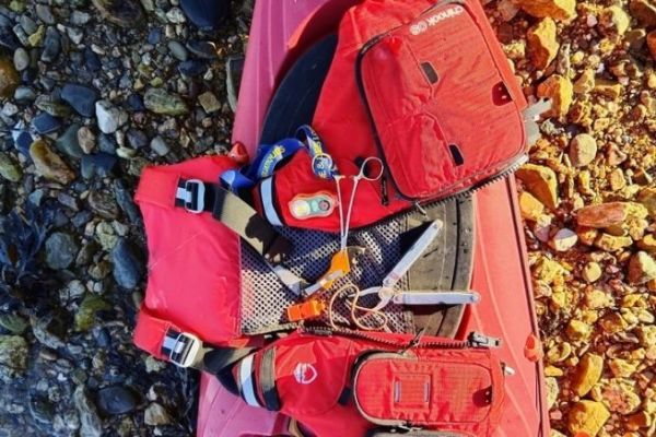 In acqua a 7/8°C, non si rimane a lungo in acqua. Ho indossato abbigliamento intimo tecnico. Una speciale muta invernale in neoprene da 3 mm, una salopette da kayak con calze integrate, una giacca da orologio con polsini al collo e ai polsi, scarpe da sub, guanti e, naturalmente, il giubbotto di salvataggio che indossavo.