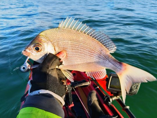 A seconda delle correnti di marea, utilizzo tenie di peso compreso tra 30 e 60 grammi, attenendomi al principio di pescare il più leggero possibile, mantenendo sempre il controllo della tenia. È fondamentale evitare che la lenza si appesantisca troppo. Pesco in verticale sotto il kayak e lascio che la lenza assuma un angolo massimo di 30 gradi, tenendo d'occhio la topografia del fondo. Il tenya deve aderire al fondo il più possibile. Ecco perché questa tecnica scoraggia molti pescatori, che preferiscono usare i kabura, che sono animati sopra il fondo, in modo da avere una minore perdita di materiale. Con un po' di perseveranza e qualche amo sul fondo, questa tecnica si rivela formidabile e spesso attira qualche bel pesce.