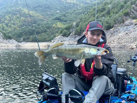 Si può pescare dal kayak utilizzando esche morbide come shad o finesse da 10 a 18 cm con testa piombata, in linea retta lungo i bordi e le pause. Anche l'uso di pesci che nuotano (jerkbait, cranbait poco profondi) dà buoni risultati, purché si controlli la stabilità del kayak durante i lanci più difficili.
