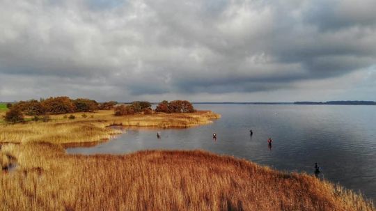 Poi, fino alla fine di novembre, vado sull'isola di Rügen, in Germania, dove offro guide di pesca al luccio. Si pesca in wading, con mosche o esche artificiali, in meno di 80 cm d'acqua, con avvistamenti spettacolari. Ci muoviamo su altopiani erbosi di diverse centinaia di ettari, con zone in cui abbondano lucci di ottima taglia media.
