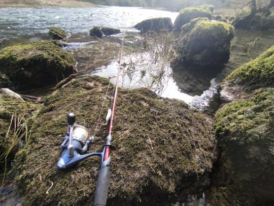 Il fiume è abbastanza largo, quindi ho preso la mia canna da 2,50 m per avere un'ampia leva, molto utile quando si pesca con esche morbide. Di media potenza, quindi molto versatile. Il mulinello è dotato di treccia per la massima sensibilità, seguita da una punta in fluorocarbon 26/100. I pesci non sono stati pescati per 6 mesi, quindi non c'è bisogno di esagerare e questo diametro, che può sembrare grande, sarà molto utile per salvare qualche esca.